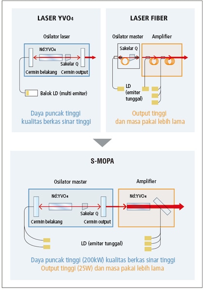 Laser YVO4 kualitas tinggi digunakan sebagai osilator master dan diumpankan ke amplifier berbasis teknologi FIBER untuk mengombinasikan elemen terbaik kedua teknologi tersebut. Karena menggunakan diode laser emiter tunggal, masa pakai menjadi lebih lama daripada teknologi konvensional.
