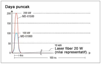 Seri MD-X1500 memiliki daya puncak 200 kW, atau 4 kali lebih tinggi dibanding daya puncak model-model YVO4 kami sebelumnya. Seri MD-X1500 mengombinasikan daya puncak tinggi dengan lebar denyut pendek (4ns) untuk meminimalkan kerusakan akibat perpindahan panas ke target. Berkat kemampuan ini, Seri MD-X1500 menjadi penanda laser yang optimal untuk aplikasi yang efek perpindahan panas perlu dihilangkan contohnya penandaan pada resin atau plastik.