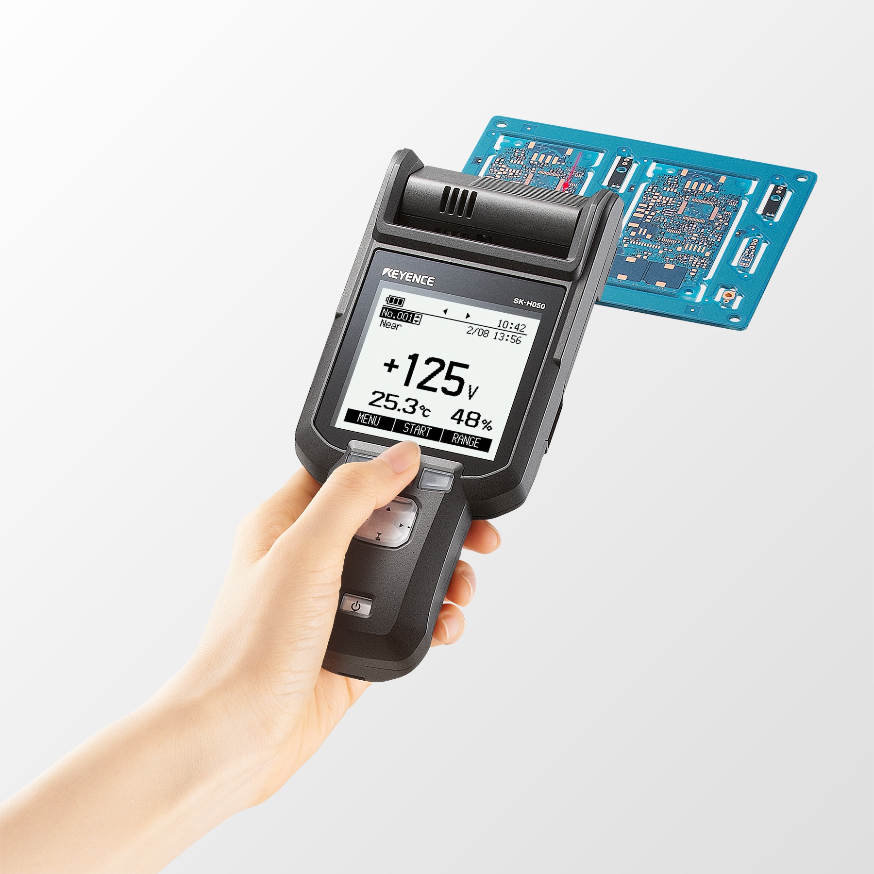 Sensor elektrostatis tipe genggam KEYENCE banyak digunakan sebagai model tingkat pemula untuk mengukur muatan listrik statis. Sensor ini juga dapat mengukur suhu dan kelembapan, sehingga dapat membantu Anda memahami secara komprehensif hubungan antara kondisi lingkungan dan listrik statis. Selain itu, sensor ini dapat mengevaluasi performa eliminasi statis, seperti kecepatan dan keseimbangan ion, dari ionizer. Dengan cara ini, sensor ini meningkatkan pengoperasian dan pemeliharaan ionizer yang efektif sekaligus membantu mencegah masalah listrik statis. Sensor genggam ini memungkinkan pengukuran yang fleksibel di lokasi mana pun, memberikannya keuntungan utama dalam mendukung beragam kebutuhan dalam aplikasi di tempat.