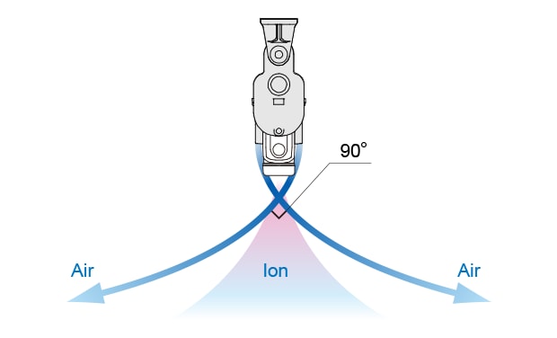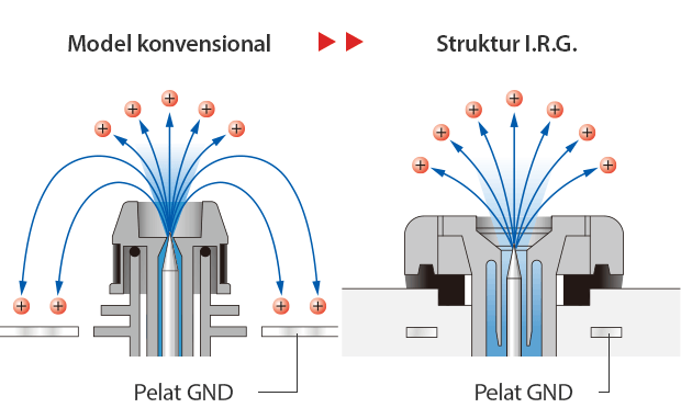Dalam model konvensional, pelat GND — yang penting untuk pembentukan ion — dipasang secara eksternal. Akan tetapi, Seri SJ-H dari KEYENCE, adalah yang pertama kali mengadopsi struktur I.R.G.(Insert Ring Ground), yang meliputi pelat di dalam pengion. Dengan mengarahkan ion yang dihasilkan ke target alih-alih pelat GND, kerugian diminimalkan dan jumlah ion yang diterapkan pada target meningkat. Hal ini memungkinkan eliminasi statis berkecepatan tinggi lima kali lebih cepat daripada model konvensional.