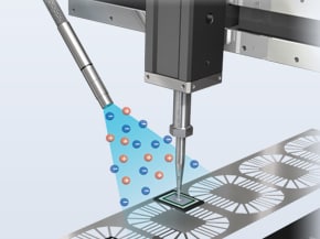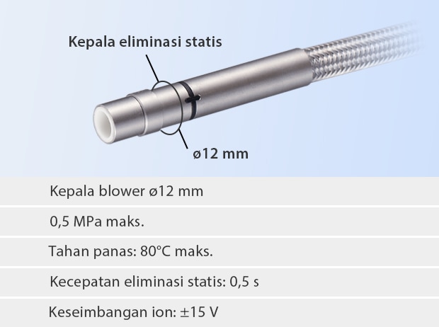 Kepala eliminasi statis ultra-kecil (ø12 mm). Karena Seri SJ-M memberikan struktur eliminasi statis langsung yang menempatkan titik pembangkitan ion pada ujung kepala, hal tersebut memungkinkan eliminasi statis kecepatan tinggi dan presisi tinggi dengan memancarkan sejumlah besar ion tanpa meredam ion dari kepala kecil.