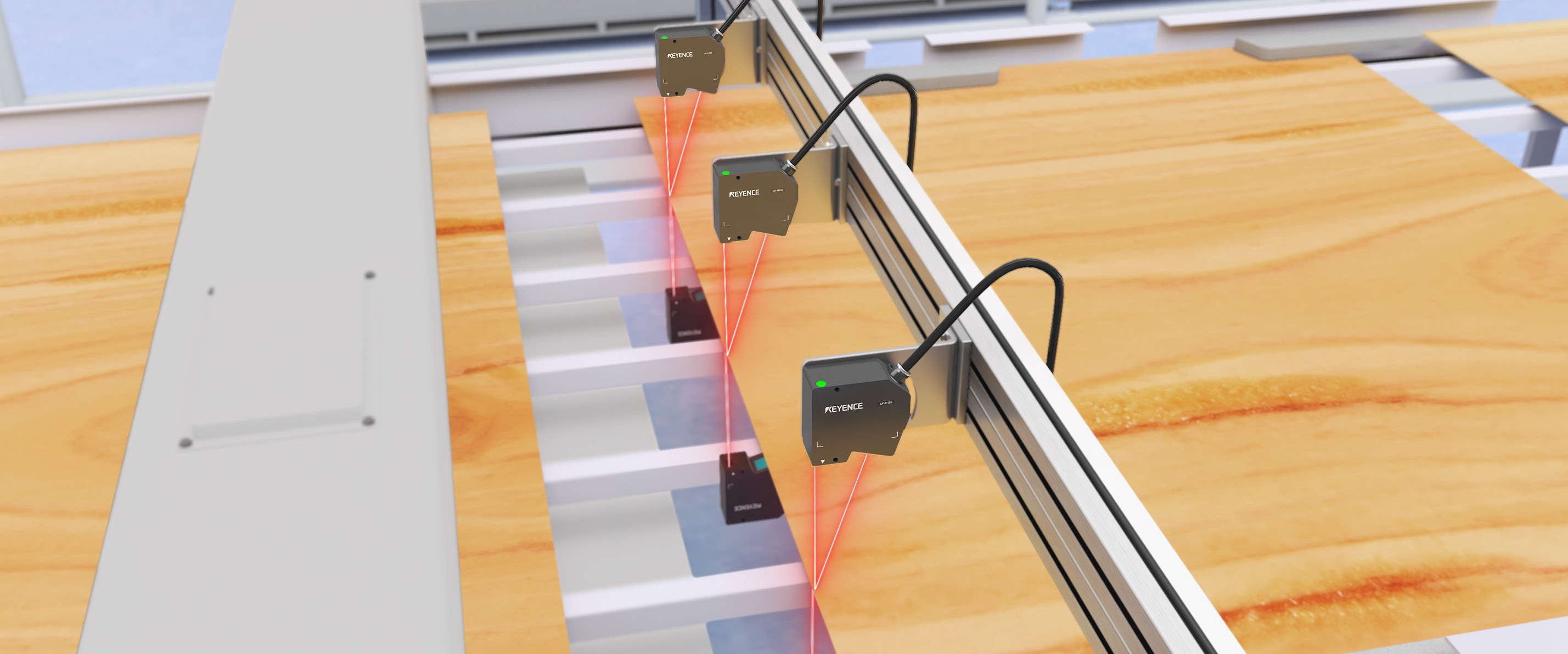 Papan kayu lapis dibuat dengan merekatkan beberapa veneer, yang dapat menyebabkan variasi ketebalan pada lebarnya. Sensor displacement laser dapat dipasang di seluruh papan untuk terus memantau variasi ketebalan. Inspeksi ketebalan selama proses pembuatan akan memberikan laju hasil yang lebih tinggi, begitu pula dengan kualitasnya.