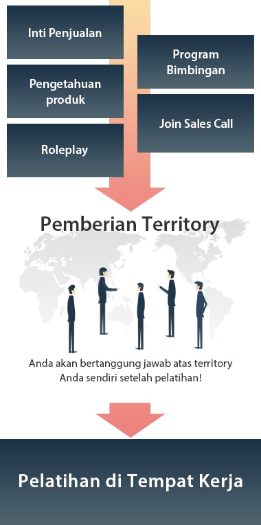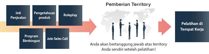 Setelah mendapatkan semua pelatihan di atas, Anda akan ditugaskan untuk bertanggung jawab atas territory tertentu sebagai tenaga penjualan utama. Anda juga akan memiliki kesempatan untuk mengembangkan strategi penjualan yang sesuai untuk area yang menjadi tanggung jawab Anda dengan menganalisis pasar dan situasi pelanggan guna memaksimalkan peluang penjualan untuk area tersebut, yang semuanya Anda lakukan sendiri yang mana hal tersebut sangat menantang.