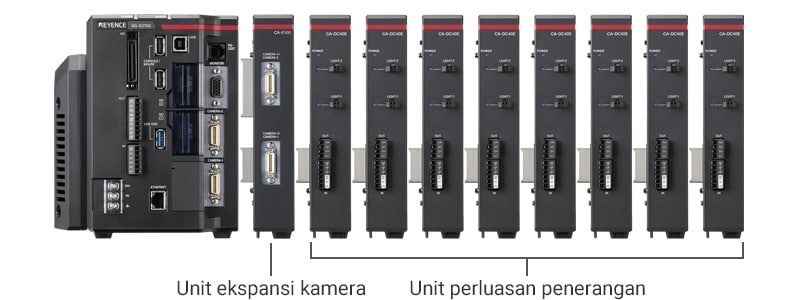 Kontroler lampu LED dapat disambungkan secara langsung ke sistem visi yang kompatibel dengan kabel sesedikit mungkin. Kontroler memungkinkan kontrol penerangan langsung dan strobing cahaya dengan input pemicu pencitraan, tanpa memerlukan PLC. Hingga 8 unit ekspansi lampu * dapat disambungkan ke satu sistem visi, memungkinkan hingga 16 lampu bisa dikontrol tanpa kabel.